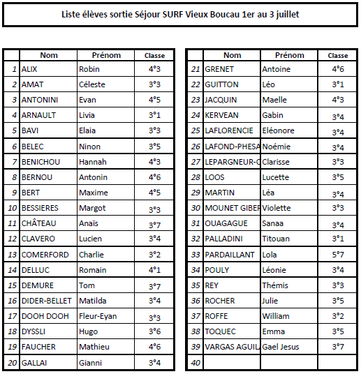 Voici la liste des élèves pour le séjour SURF de l'AS du 1er au 3 juillet 2026.