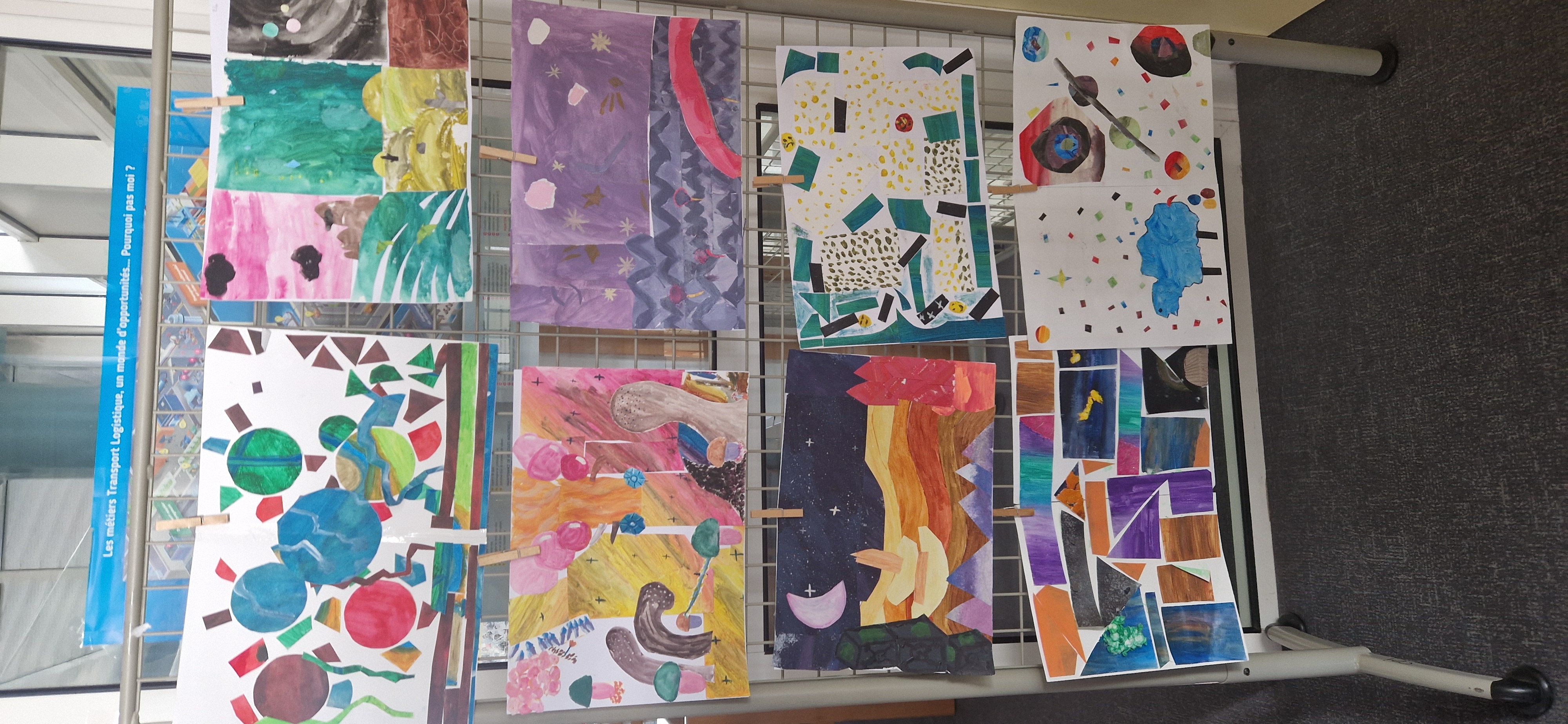 En expérimentant de nombreuses techniques de peinture, les élèves de 6ᵉ ont imaginé et représenté des paysages étranges et colorés, issus de la découverte d’une planète inconnue.