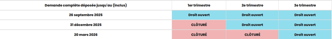 Une possibilité de déposer un dossier pour les trimestres suivants vous est offerte si vous avez dépassé les dates pour le premier trimestre mais l’inscription n’est pas rétroactive et les dates limites doivent être respectées.